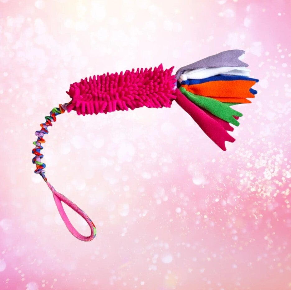 Dit speeltje van Agilitoy heeft een bijtkussen gemaakt van gekleurde microvezel, waaraan meerdere strengen van gekleurde stof zijn bevestigd. Gevoerd handvat met elastisch gedeelte. Totale lengte: 80 cm.